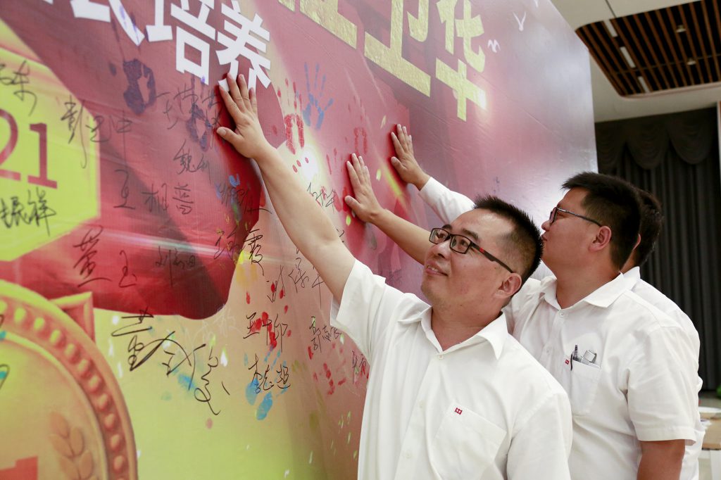 各位班组长学员在当初许下“学习先进管理知识,打造卫华金牌班组”铮铮誓言的签名墙上留下掌印,五彩斑斓的掌印天空,记录了他们一路成长的印记。