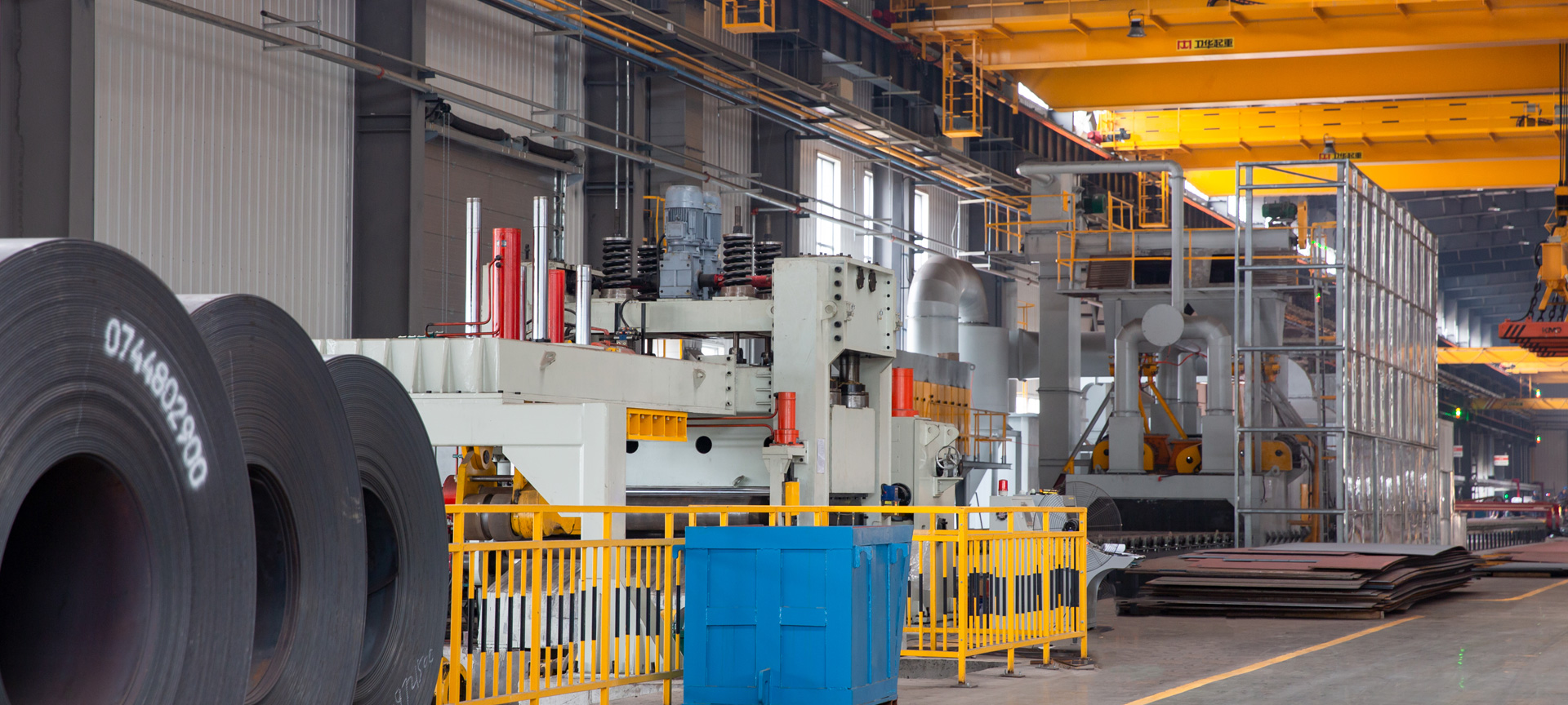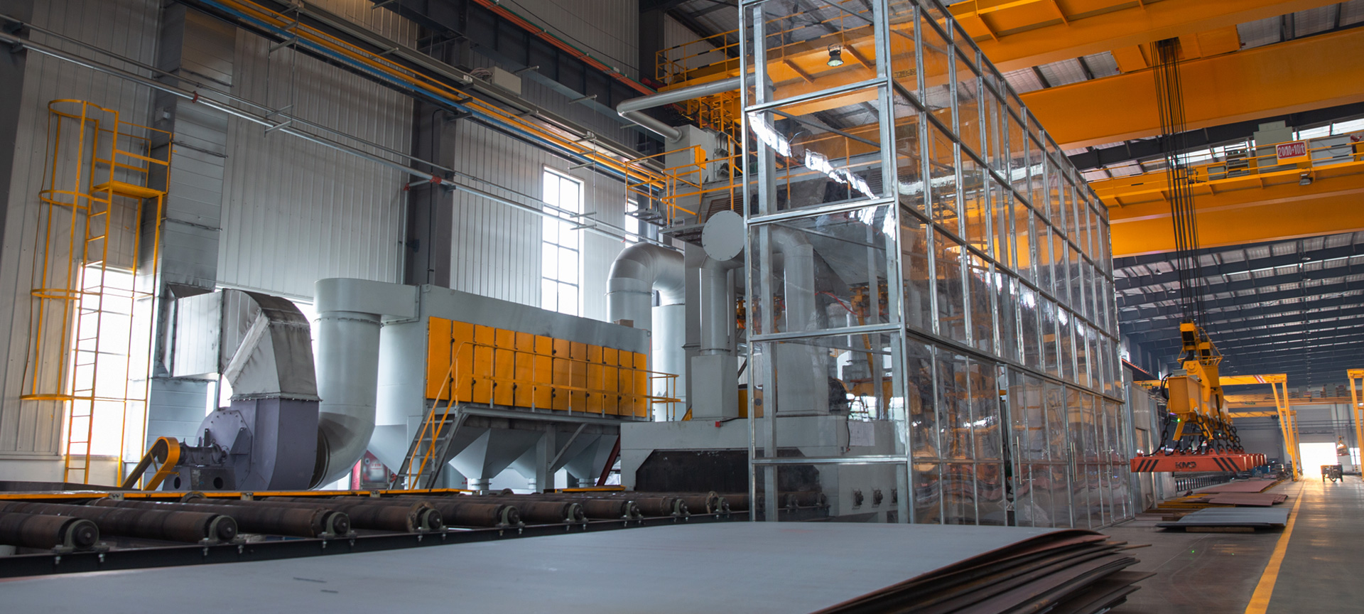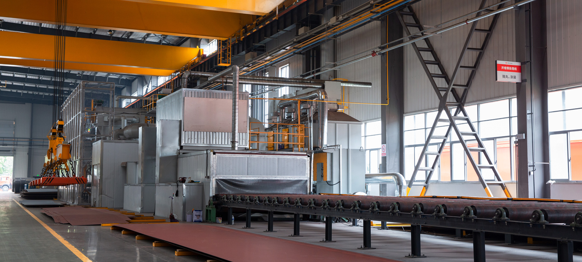 我公司拥有5条QXY3000、QYX6930钢板与型材预处理生产线(抛丸、喷漆、烘干一条线)。在抛(喷)丸之后的钢材,为了防止生锈,预处理结束后在规定的时间内,立即喷涂底漆。桥架、小车架等主要结构件所用的钢材均经过预处理后方进入生产车间。
